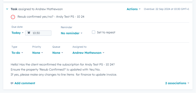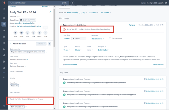 - Update the “Resub Fee Value Checked & Updated by Finance” property to “YES” for the Account Managers to confirm resubscription prior to sending out invoice.