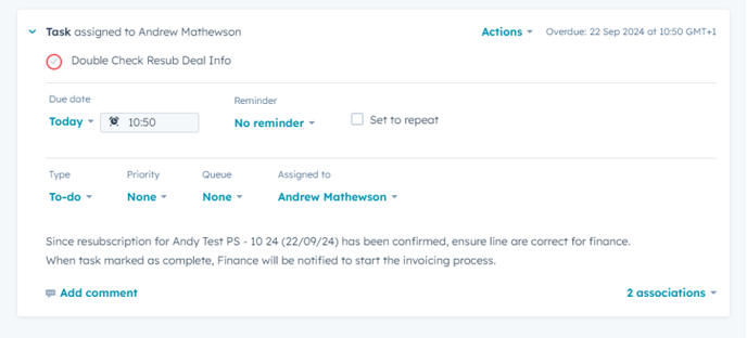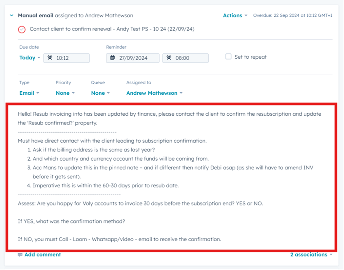 “Since resubscription has been confirmed, ensure line are correct for finance. If any changes to line items please create a TASK for Sarah in Finance. When task marked as complete, Finance will be notified to start the invoicing process".