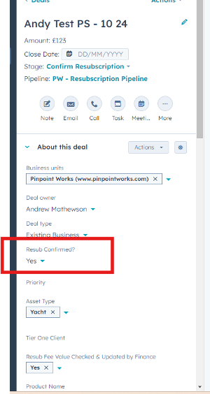 Once you have updated the property ”Resub Confirmed” with YES, this will automate the next stage of the workflow. The ”NO” option will be covered later on within the SOP.